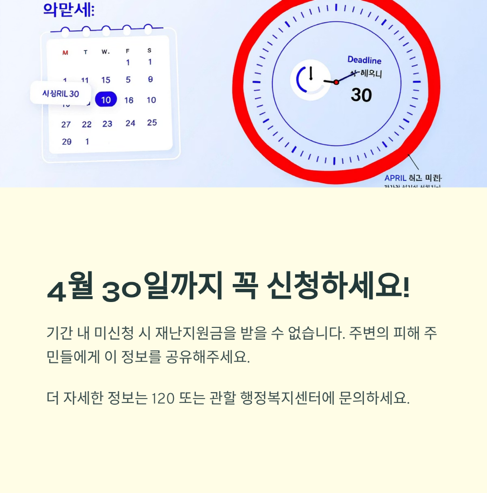 산불로 큰 피해를 입은 주민 여러분, 하루빨리 일상으로 복귀하시길 진심으로 바랍니다. 지금이 바로 지원 신청을 위한 골든타임이에요. 놓치지 마시고 꼭 필요한 도움을 받으시길 바랍니다. 주변에도 널리 알려주세요!