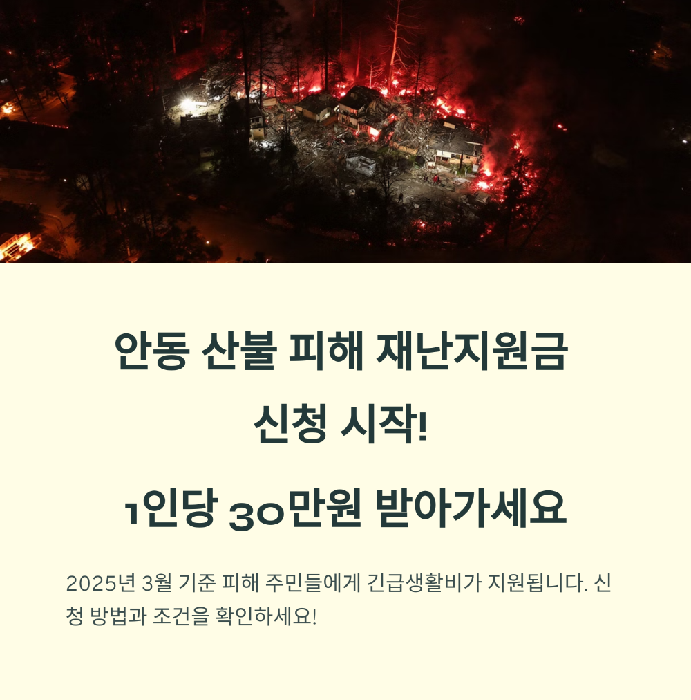 안녕하세요. 경북 안동시를 비롯한 특별재난지역 주민 여러분, 2025년 3월에 발생한 산불로 인해 많은 어려움을 겪으셨을 것으로 생각됩니다. 이에 따라 정부와 지자체에서는 긴급생활지원금, 사유재산 피해 보상, 외국인 피해자 지원 등 다양한 지원책을 마련하였습니다. 아래에서 자세한 신청 방법과 절차를 안내해드리겠습니다.