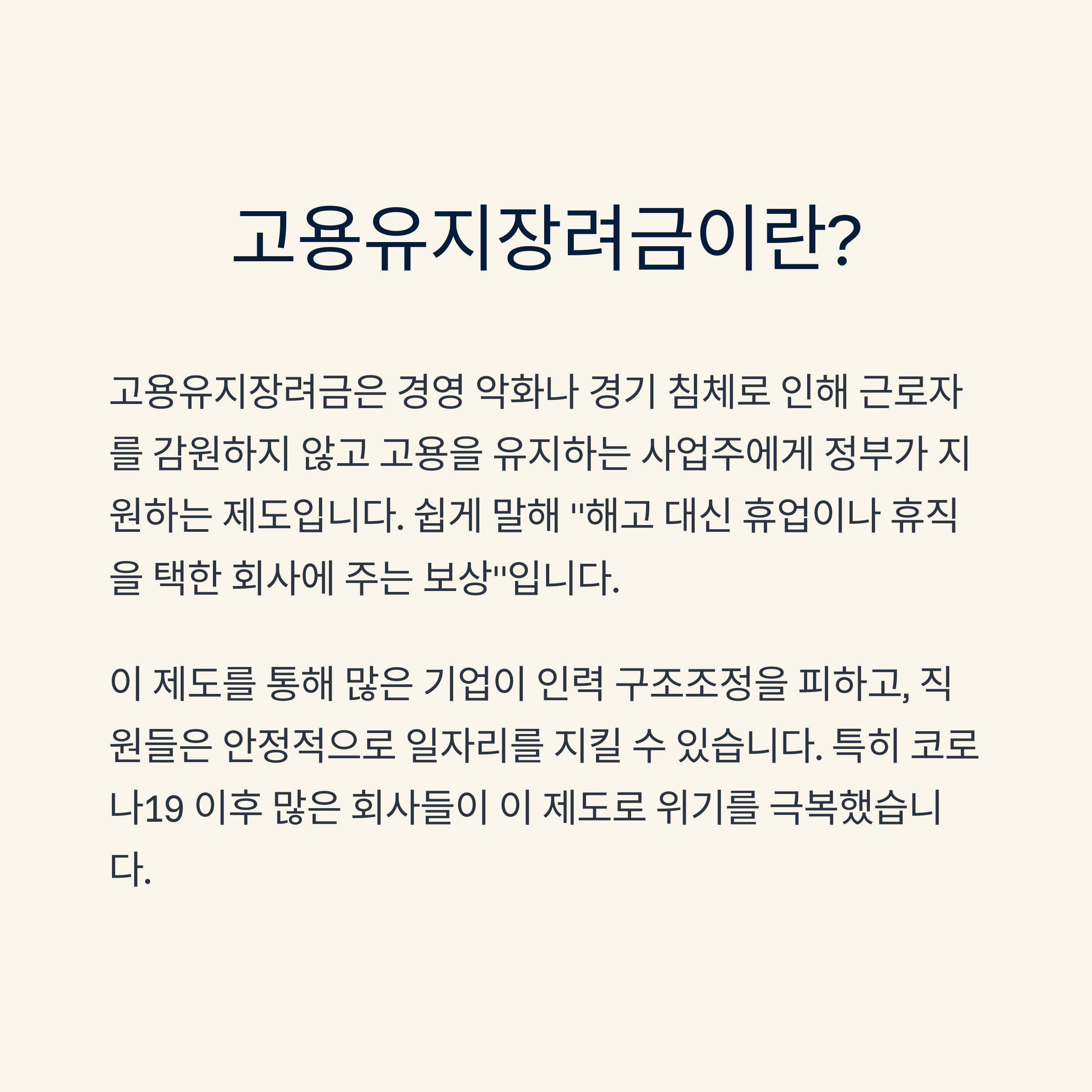 고용유지장려금은 경영 악화나 경기 침체 등의 이유로 근로자를 일시적으로 감원하지 않고 고용을 유지하는 사업주에게 정부가 일정 금액을 지원하는 제도예요. 한 마디로, "해고 대신 휴업이나 휴직을 택한 회사에게 주는 보상"이라고 보면 됩니다. 이 제도를 통해 많은 기업이 인력 구조조정을 피하고, 직원들도 안정적으로 일자리를 지킬 수 있게 되죠. 특히 코로나19 이후로 많은 회사들이 이 제도를 활용해 위기를 버텼다는 사실, 알고 계셨나요?
