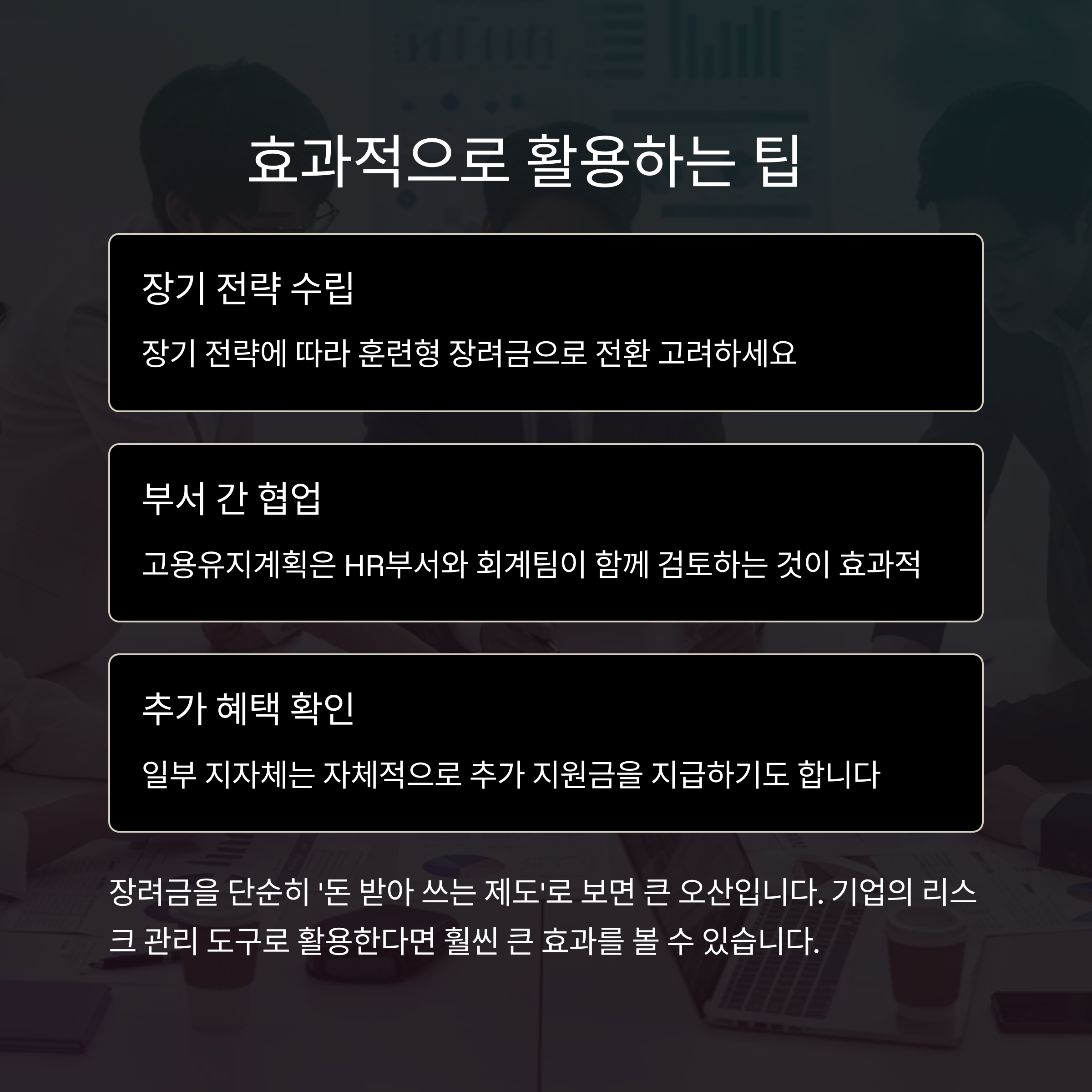 장려금을 단순히 '돈 받아 쓰는 제도'로 보면 큰 오산입니다. 기업의 리스크 관리 도구로 활용한다면 훨씬 큰 효과를 볼 수 있어요.