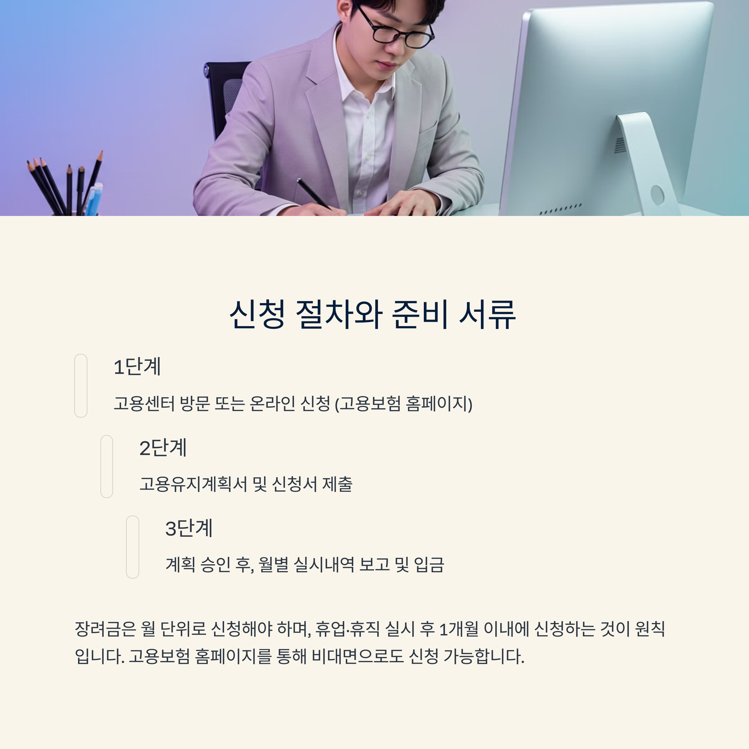 고용유지장려금 신청은 생각보다 간단하지만, 서류 미비나 절차 착오로 인해 탈락하는 경우가 많아요. 아래 절차를 꼼꼼히 따르시면 놓치는 일 없을 거예요.