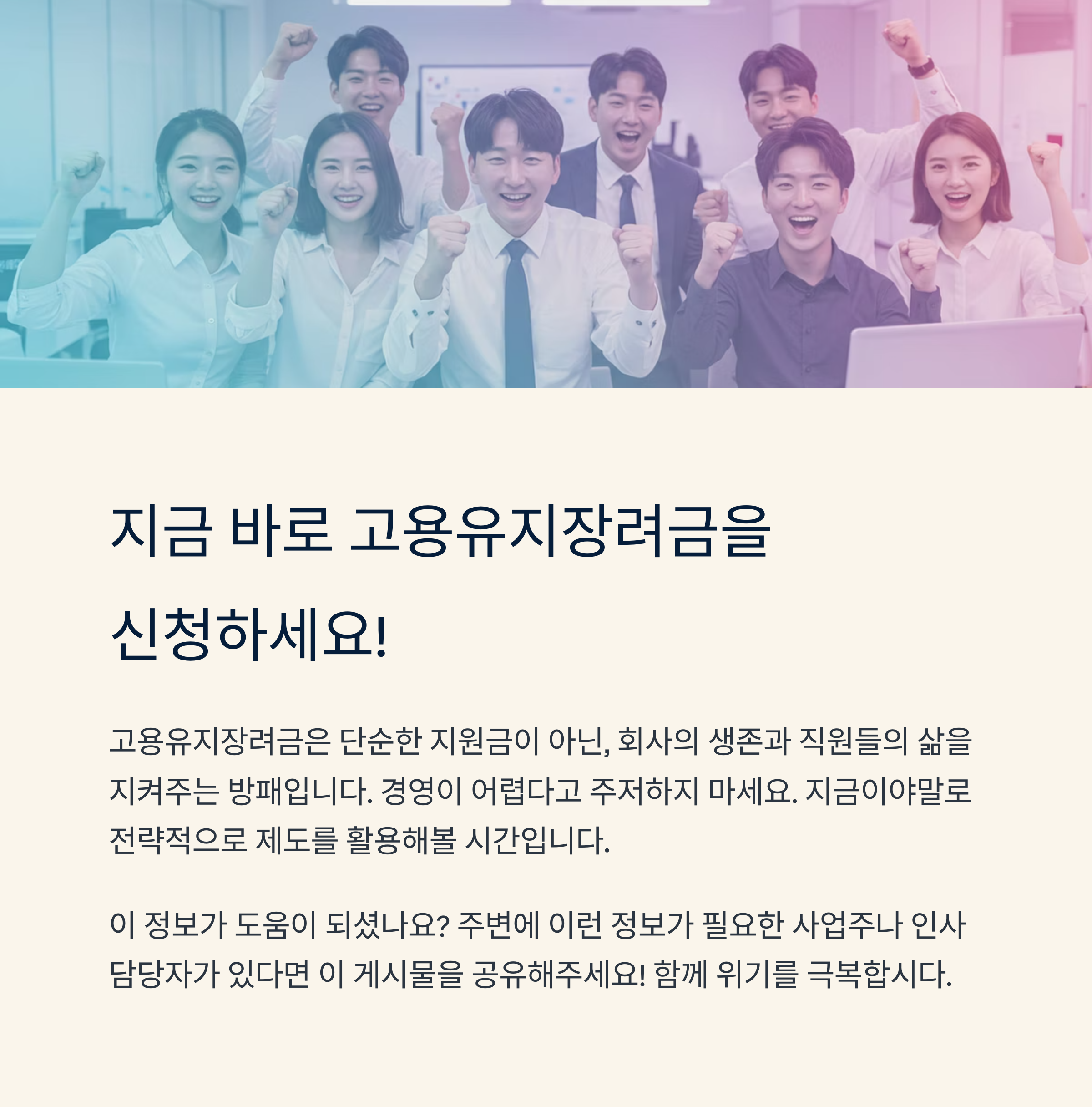 여러분, 고용유지장려금이라는 제도, 생각보다 훨씬 실용적이고 강력한 지원책이라는 걸 아셨죠? 단순히 ‘지원금 받는 제도’로만 생각하면 절대 안 됩니다. 회사의 생존, 직원들의 삶, 모두 지켜주는 방패가 될 수 있어요. 상황이 어렵다고 주저하지 마세요. 지금이야말로 전략적으로 제도를 활용해볼 시간입니다. 혹시 주변에 이런 정보가 필요한 분이 있다면, 이 글 공유도 부탁드려요!