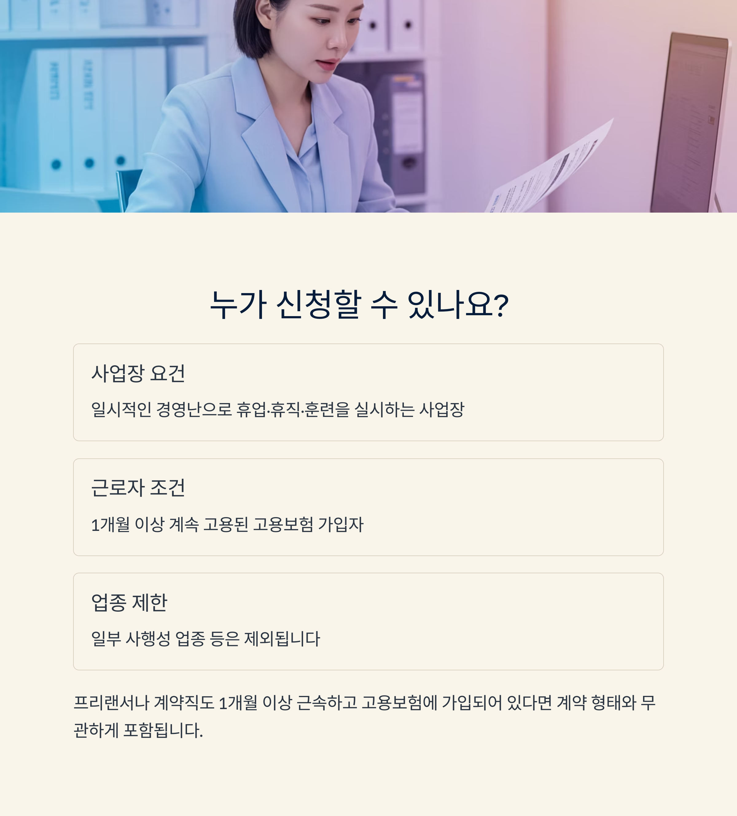 | 근로자 조건 | 1개월 이상 계속 고용된 고용보험 가입자 |