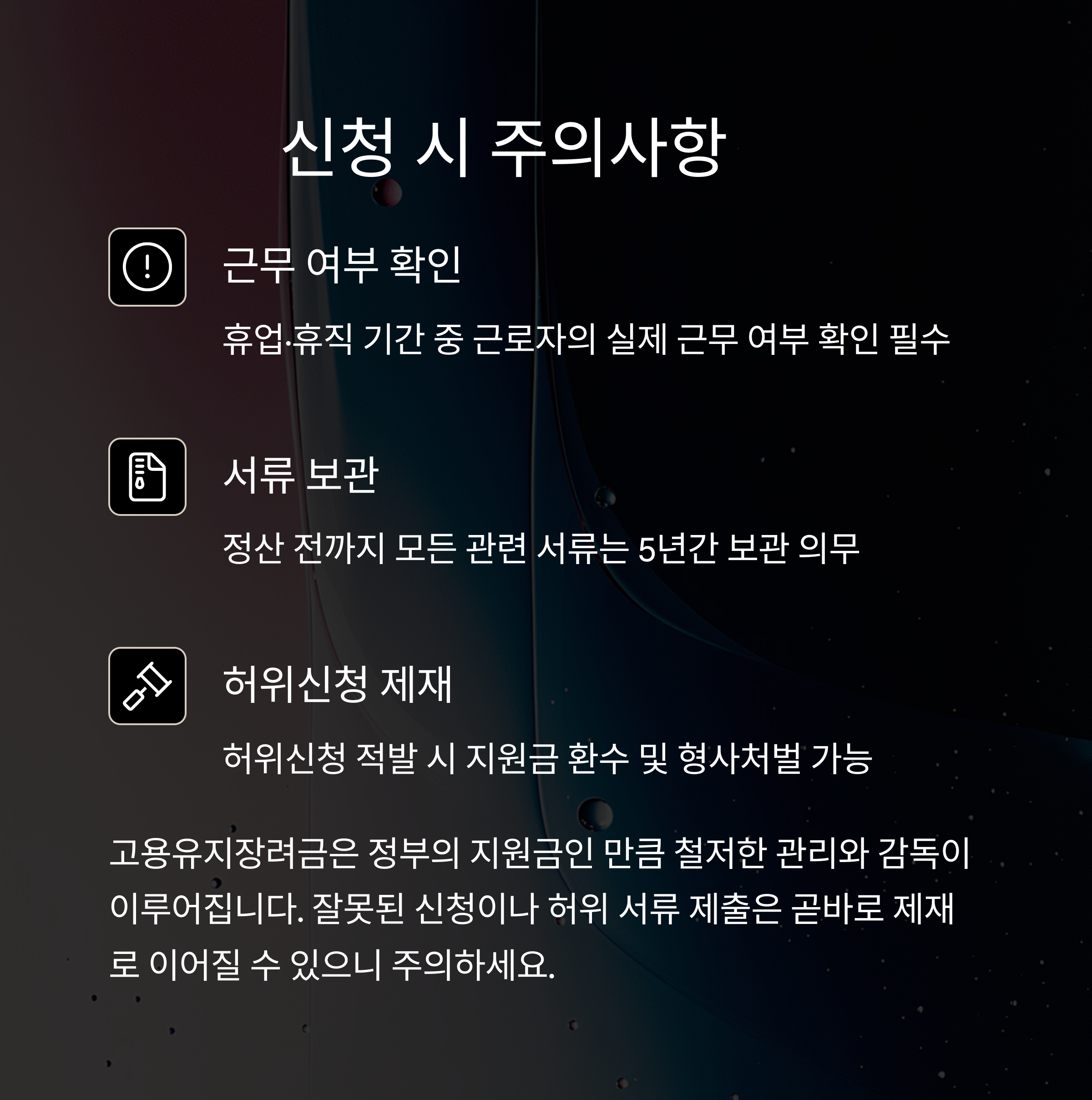 고용유지장려금은 정부의 지원금인 만큼 철저한 관리와 감독이 이루어져요. 잘못된 신청이나 허위 서류 제출은 곧바로 제재로 이어질 수 있으니 특히 아래 사항은 꼭 확인하세요.