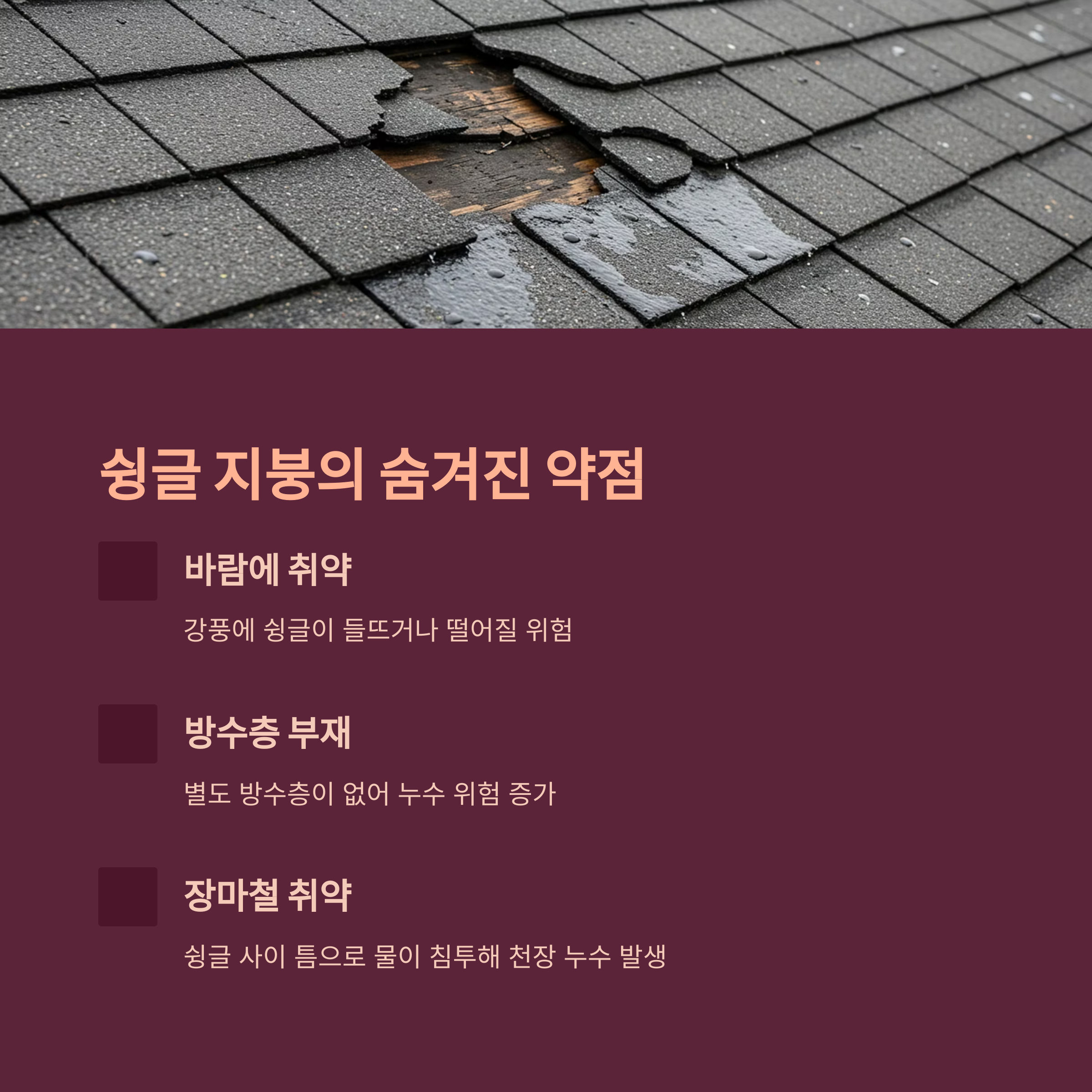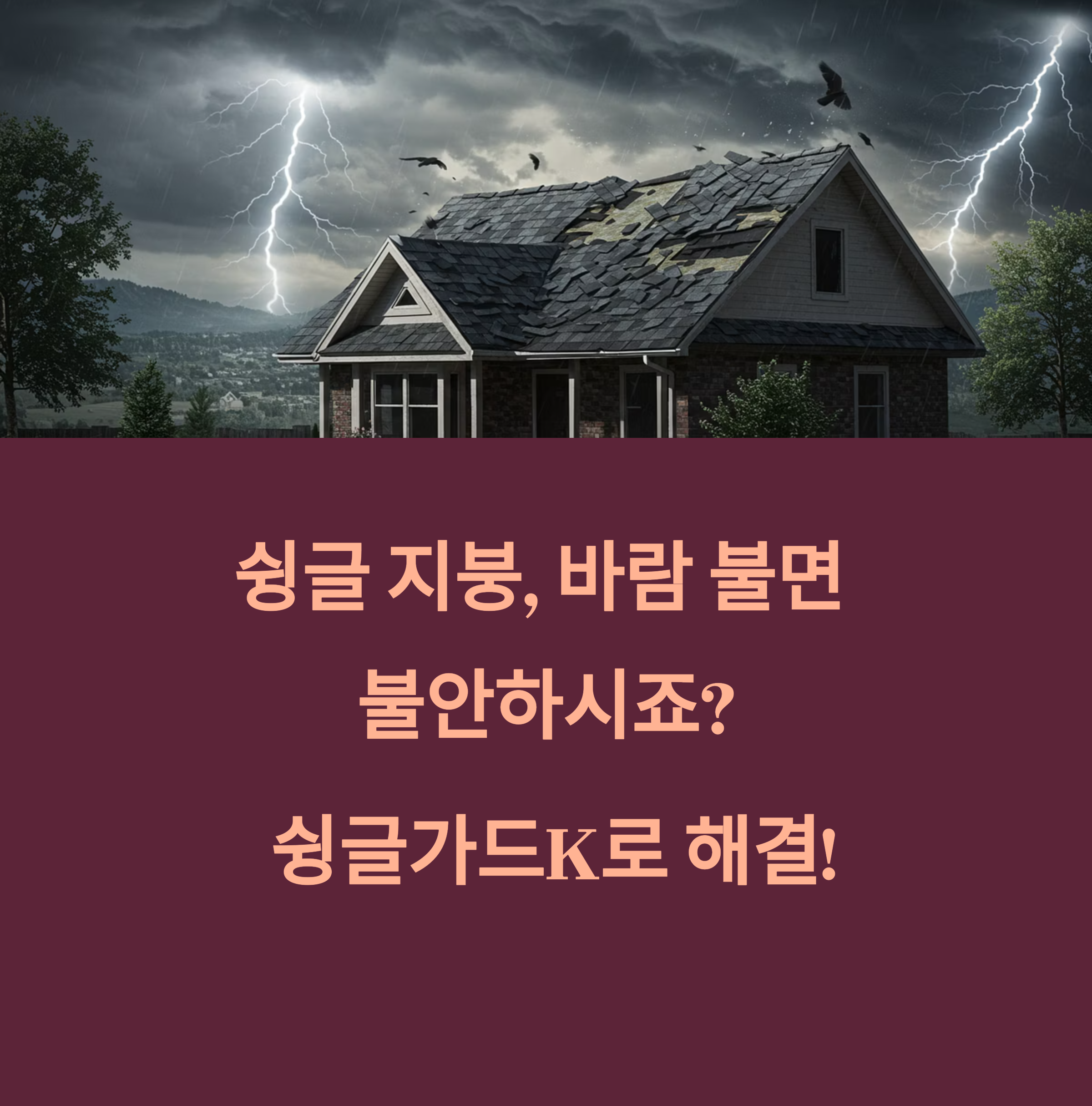 “슁글 지붕, 바람 불면 불안하시죠? 슁글가드K 하나면 폭풍도 문제 없어요!”