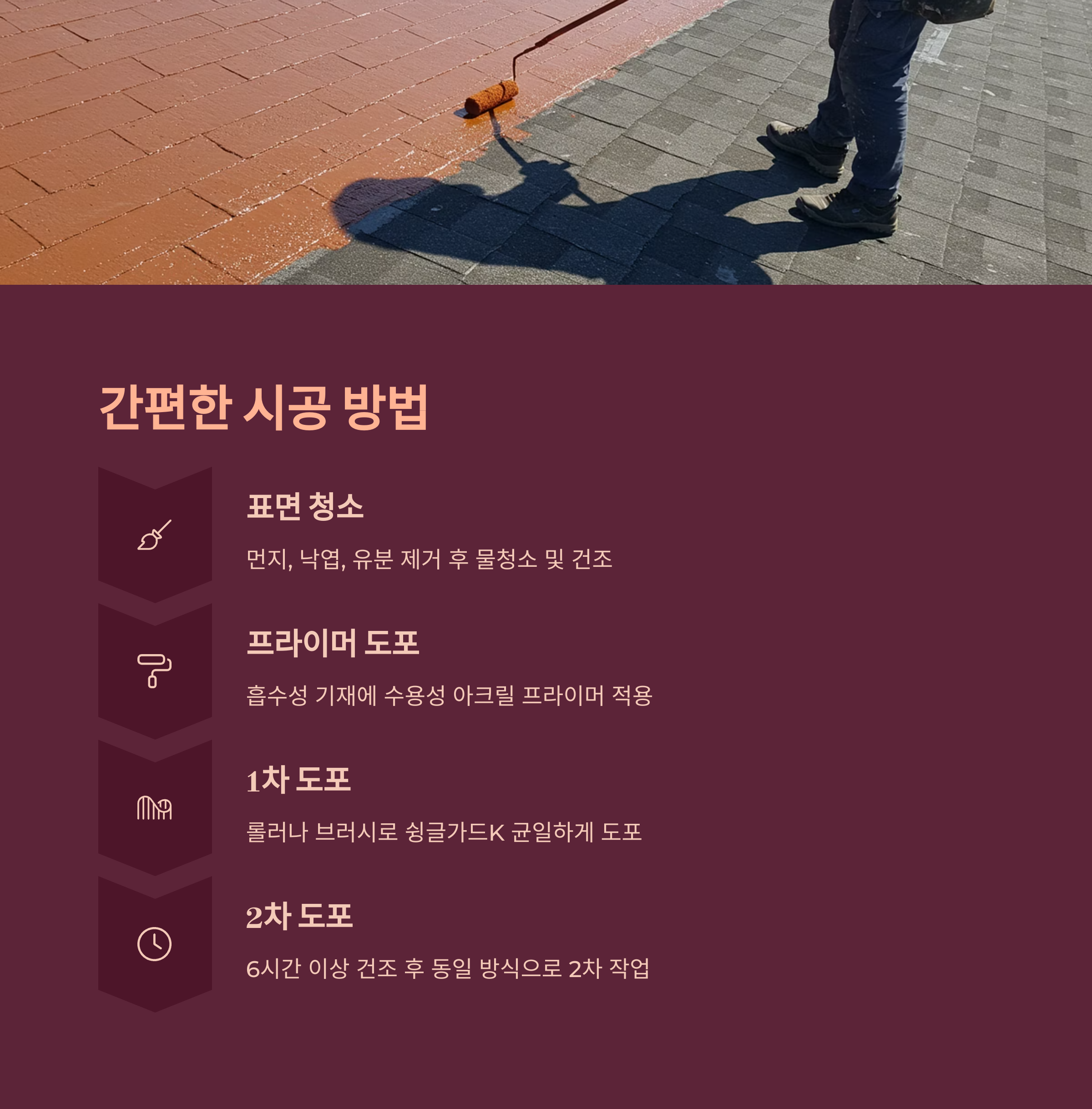| 3. 슁글가드K 1차 | 롤러 또는 브러시로 균일하게 도포 |