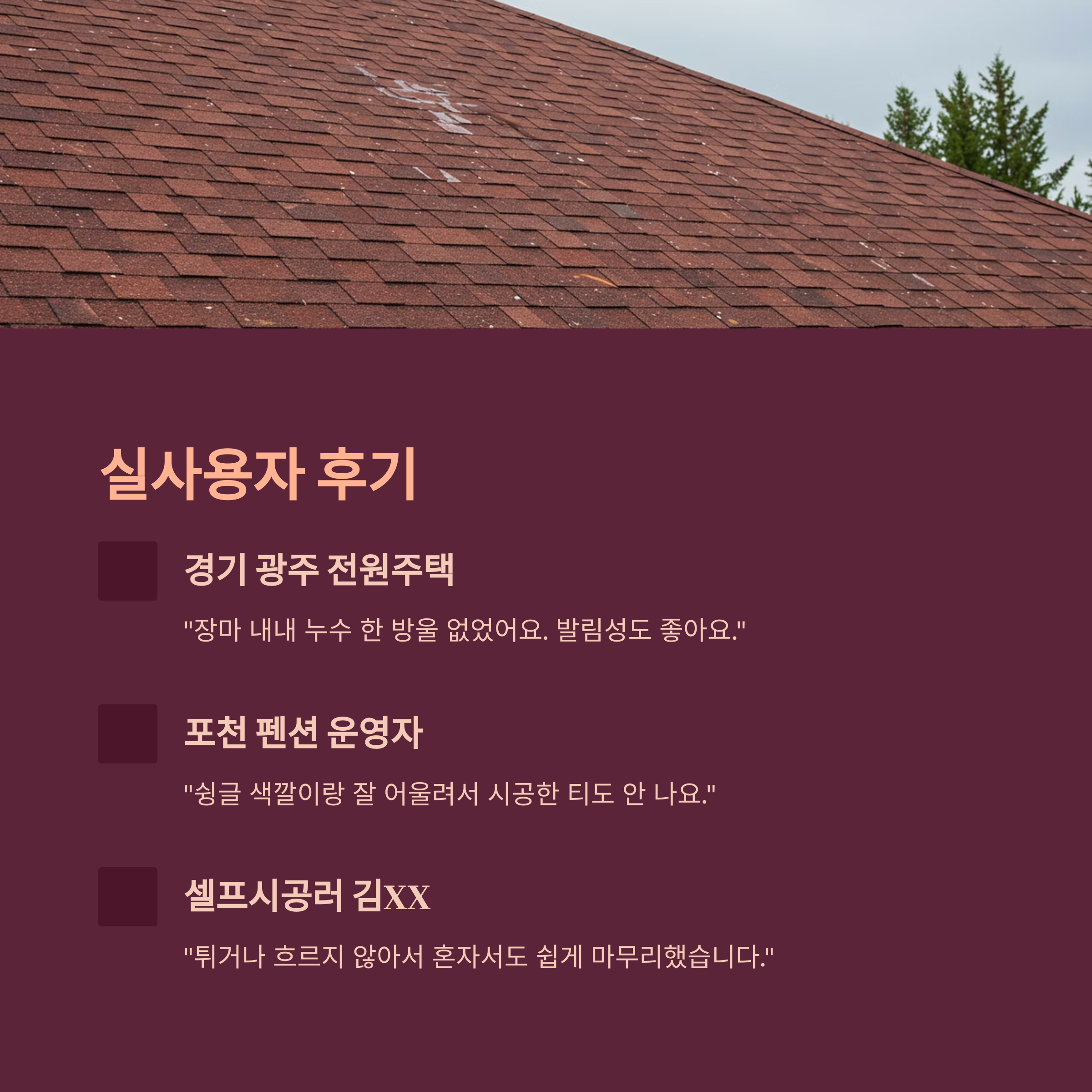- “포천 펜션 운영자: 슁글 색깔이랑 잘 어울려서 시공한 티도 안 나요.”