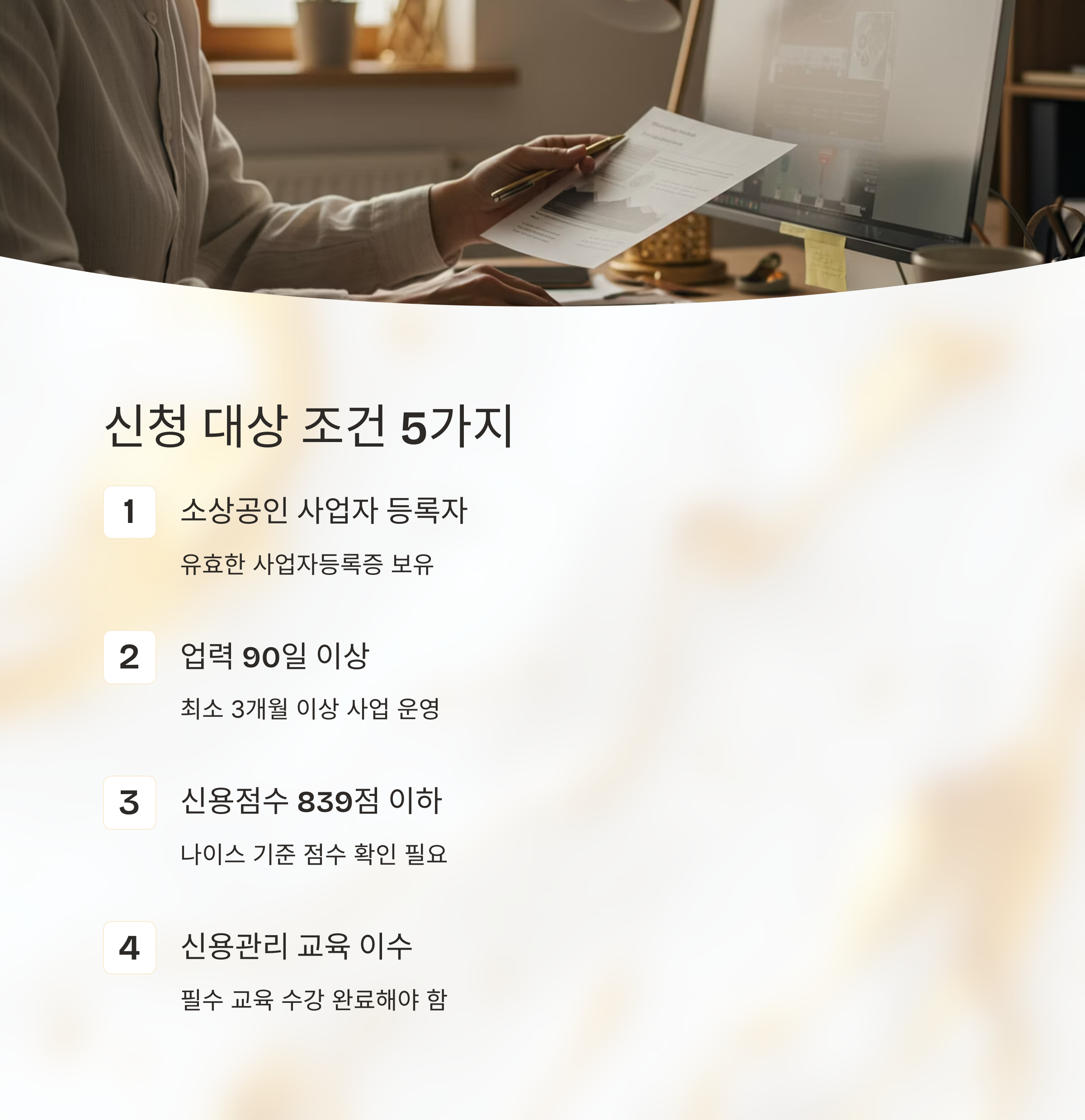 신청 자격이 까다로운 편은 아니지만, 아래 다섯 가지 조건을 모두 충족해야 합니다. 특히 신용관리 교육은 필수 조건이므로 절대 놓치지 마세요.