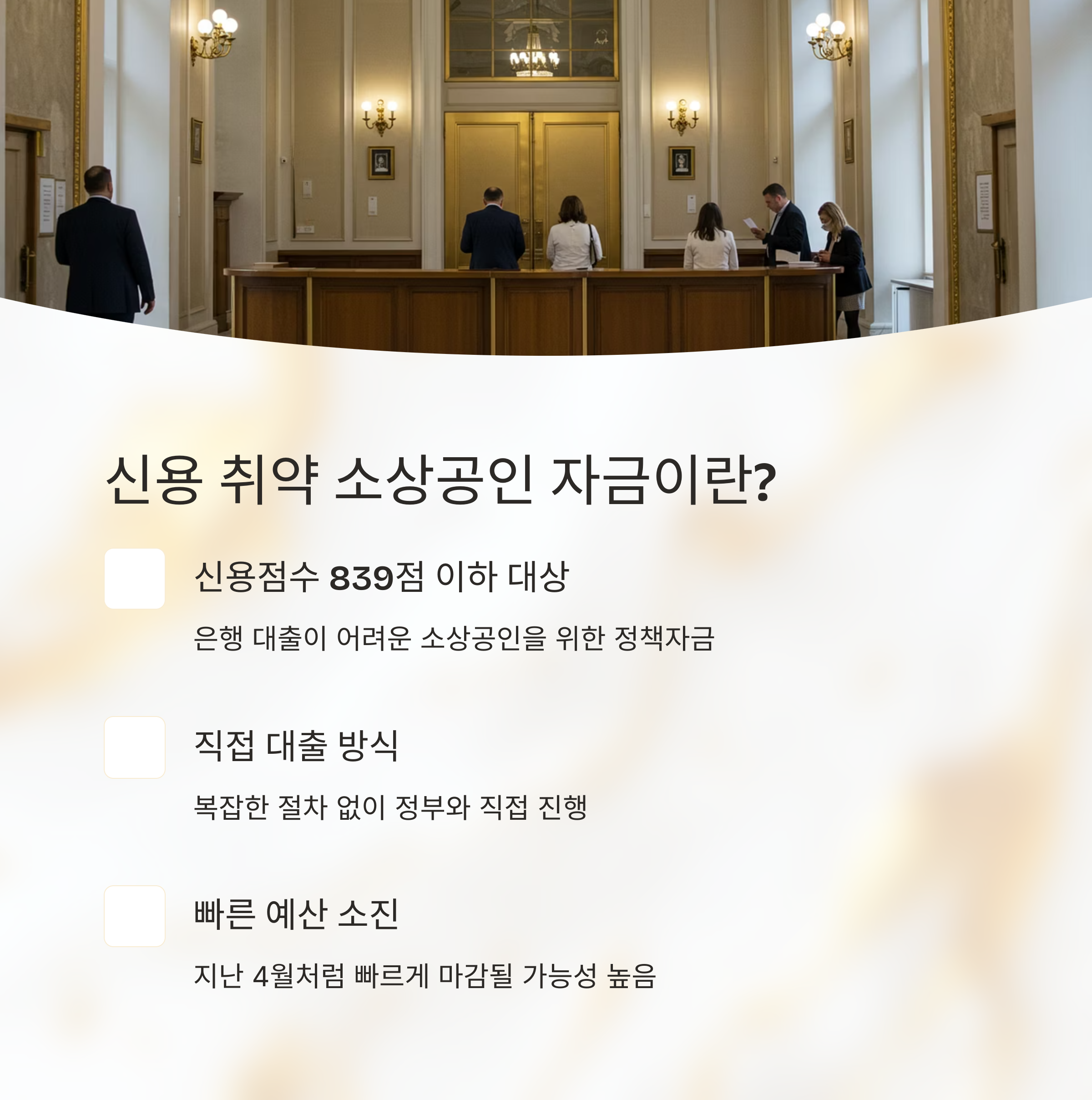 '신용 취약 소상공인 자금'은 신용점수 839점 이하인 분들을 대상으로 한 정책자금입니다. 일반 은행 대출이 어렵거나 이미 거절당한 경험이 있다면 이 자금이 대안이 될 수 있어요. 특히 대리 대출이 아닌 직접 대출 방식이라 복잡한 절차 없이 정부와 직접 진행할 수 있다는 게 큰 장점이죠. 지난 4월 접수 당시에도 예산 소진 속도가 빨랐고, 이번에도 마찬가지일 가능성이 높기 때문에 빠르게 준비하셔야 합니다.