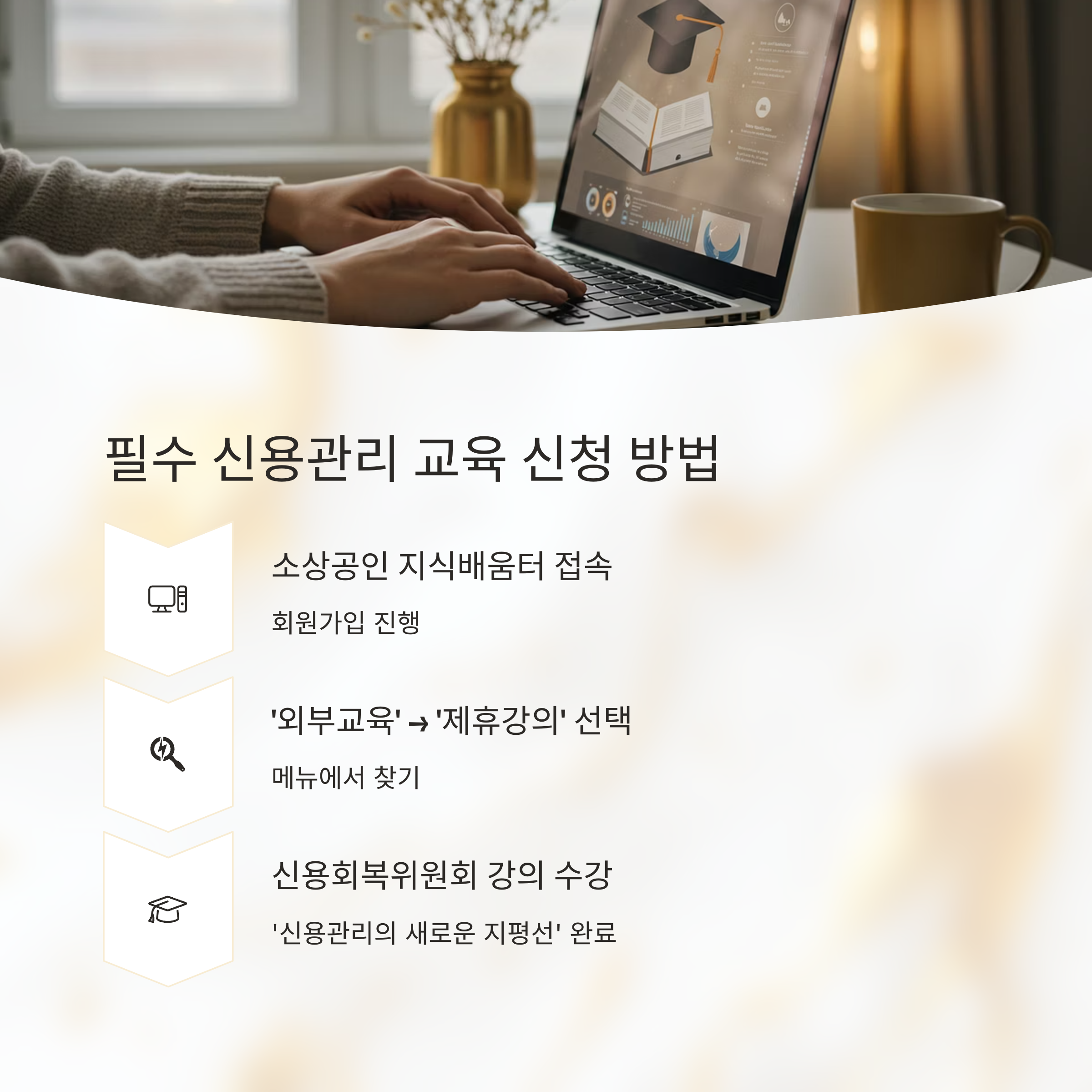 신청 조건 중 가장 간과하기 쉬운 부분이 바로 신용관리 교육입니다. 이수하지 않으면 신청 자체가 불가능해요. 교육은 '소상공인 지식배움터'에서 무료로 받을 수 있습니다. 아래 단계에 따라 빠르게 준비해 보세요.