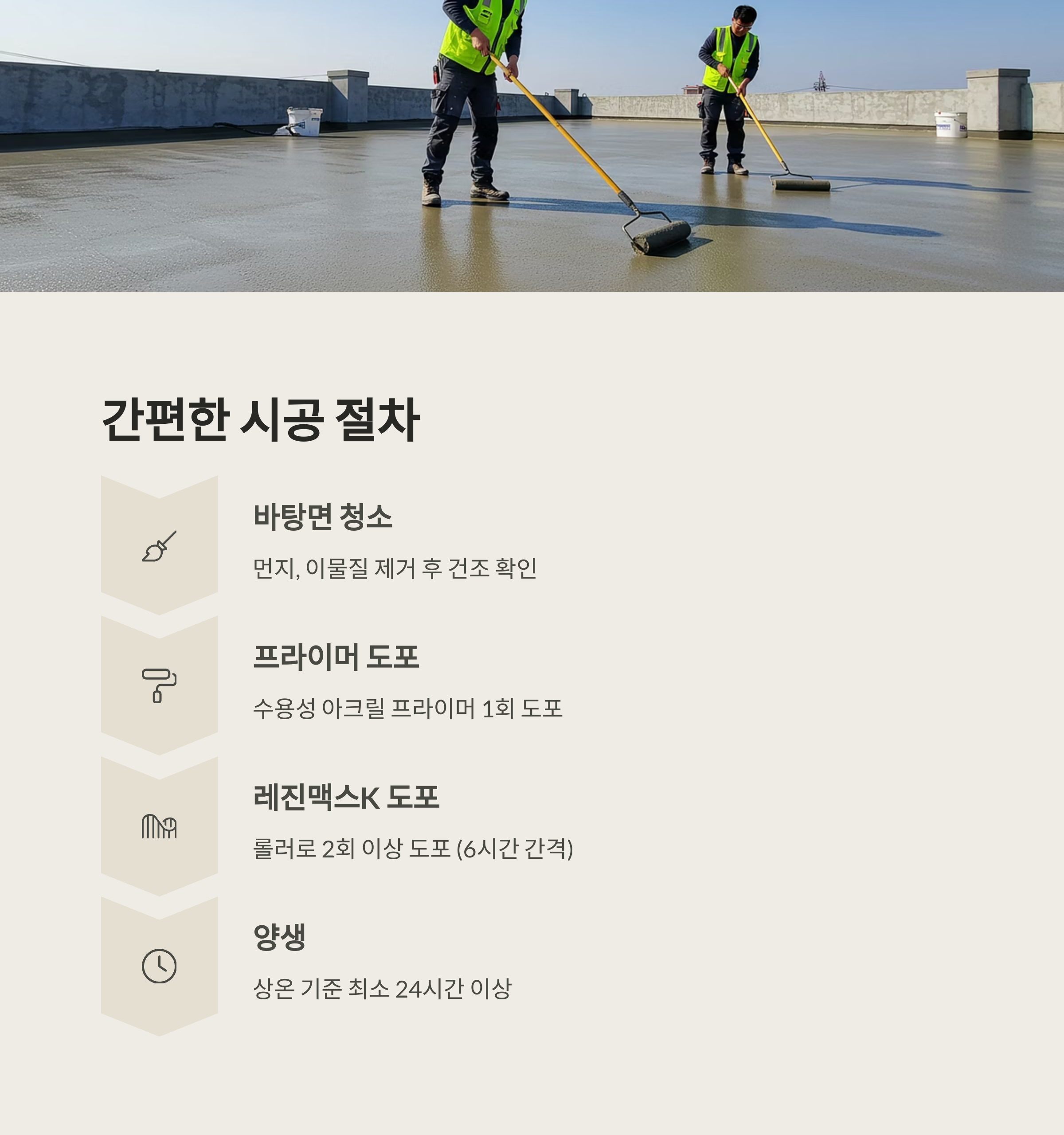 레진맥스K는 시공법이 꽤 간단하면서도 정석을 지키면 방수력은 극대화됩니다. 특히 바탕면 정리와 프라이머 도포가 관건입니다.