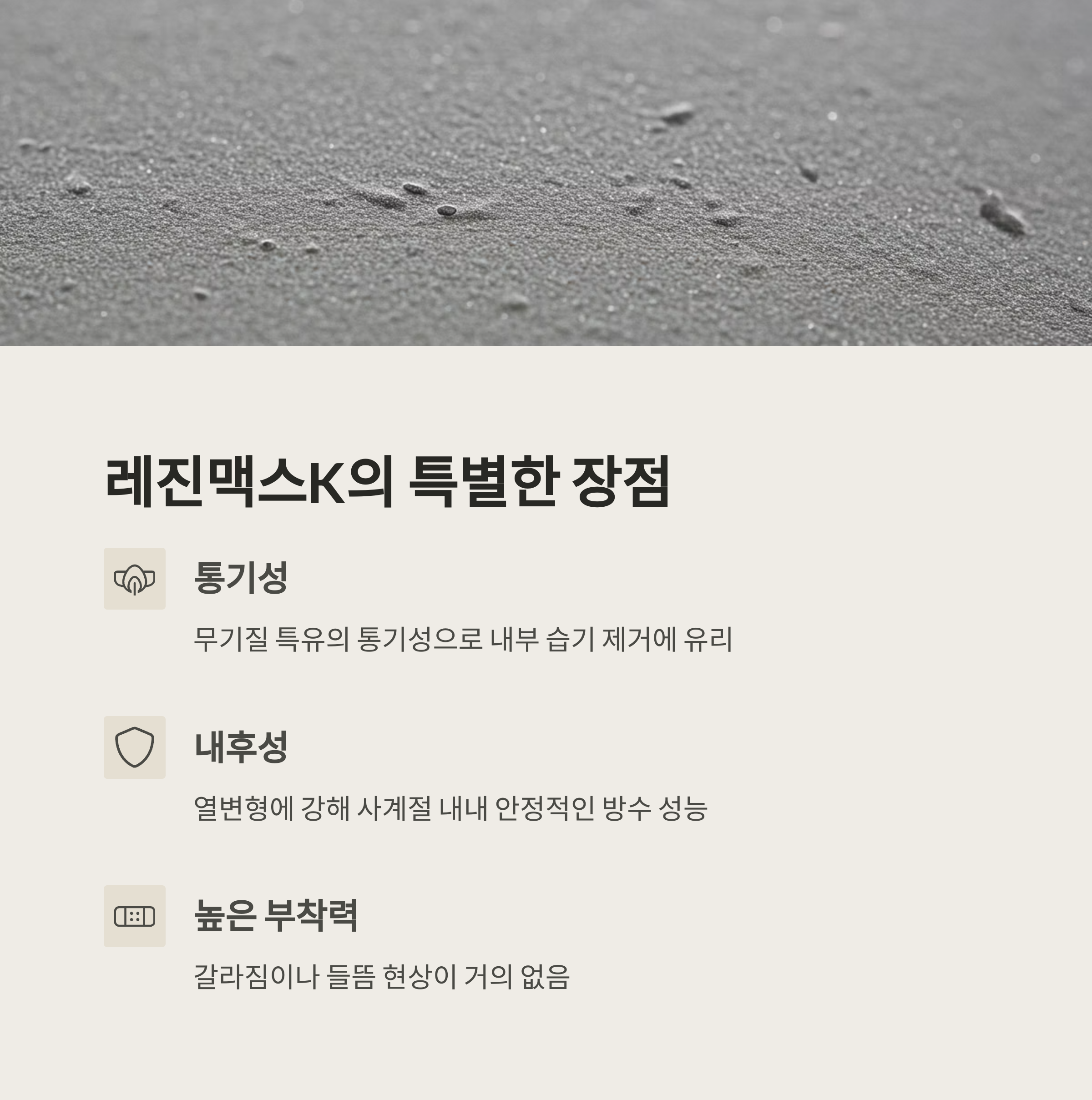 몇 년 전, 저희 건물 옥상에 아크릴계 방수제를 시공한 적이 있었어요. 시공 직후엔 멀쩡해 보였는데, 겨울이 지나고 봄이 되자 군데군데 갈라짐이 생기더니 장마철엔 빗물이 그대로 스며들어 내부 누수로 이어졌습니다. 당시 전문가가 말하길, “열화에 약한 유기질 방수제는 고온·저온 반복에 취약하다”고 하더라고요. 그 이후로는 무기질 방수제만 찾게 되었고, 드디어 레진맥스K를 만나게 됐습니다.
