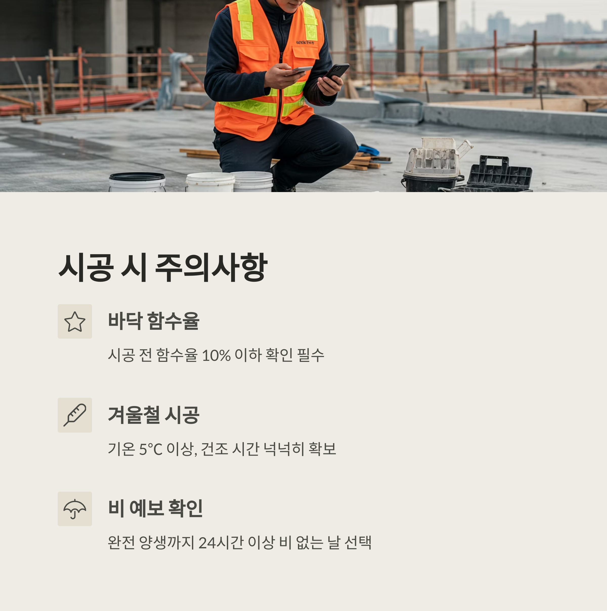 - 겨울철 시공 시에는 건조 시간 여유롭게 확보할 것