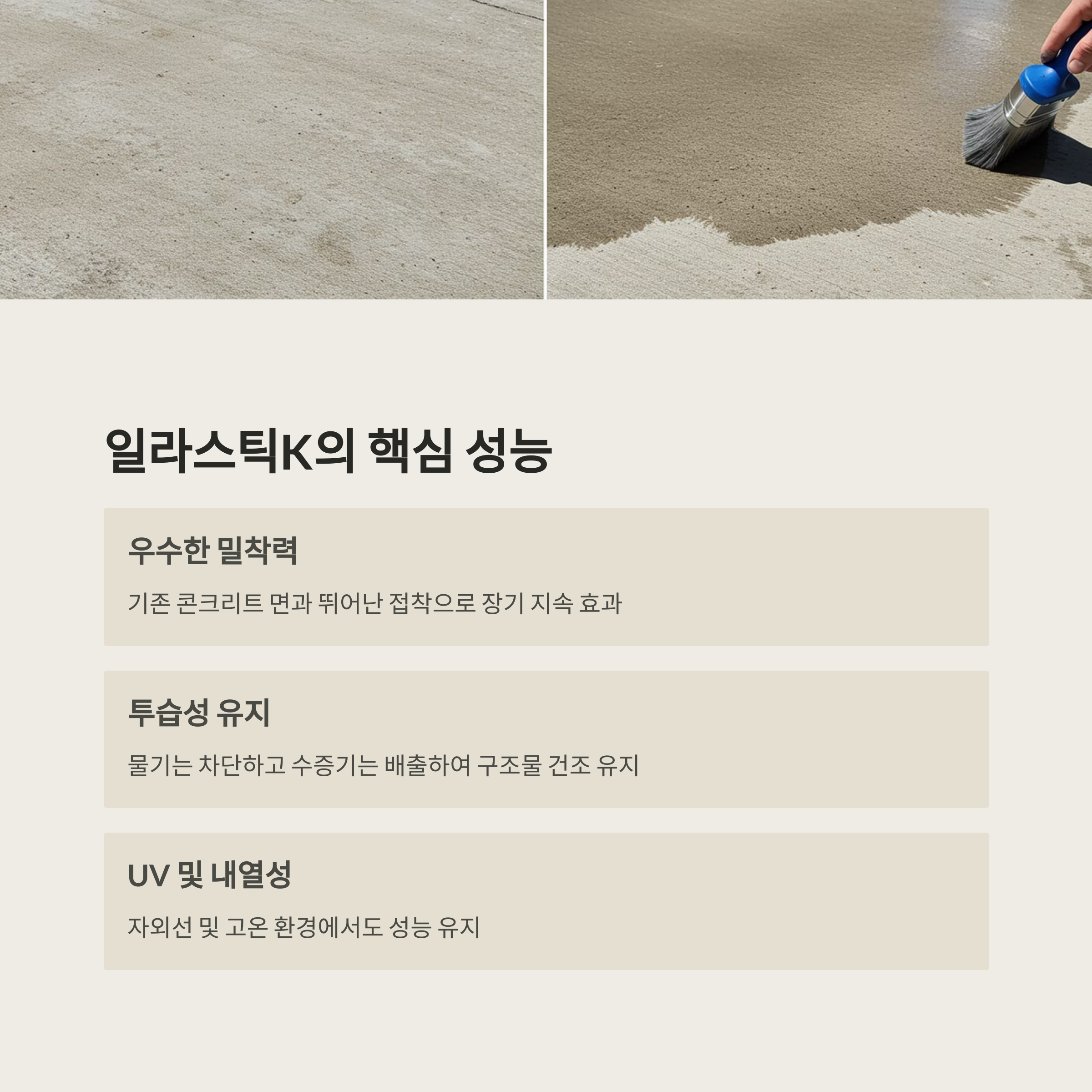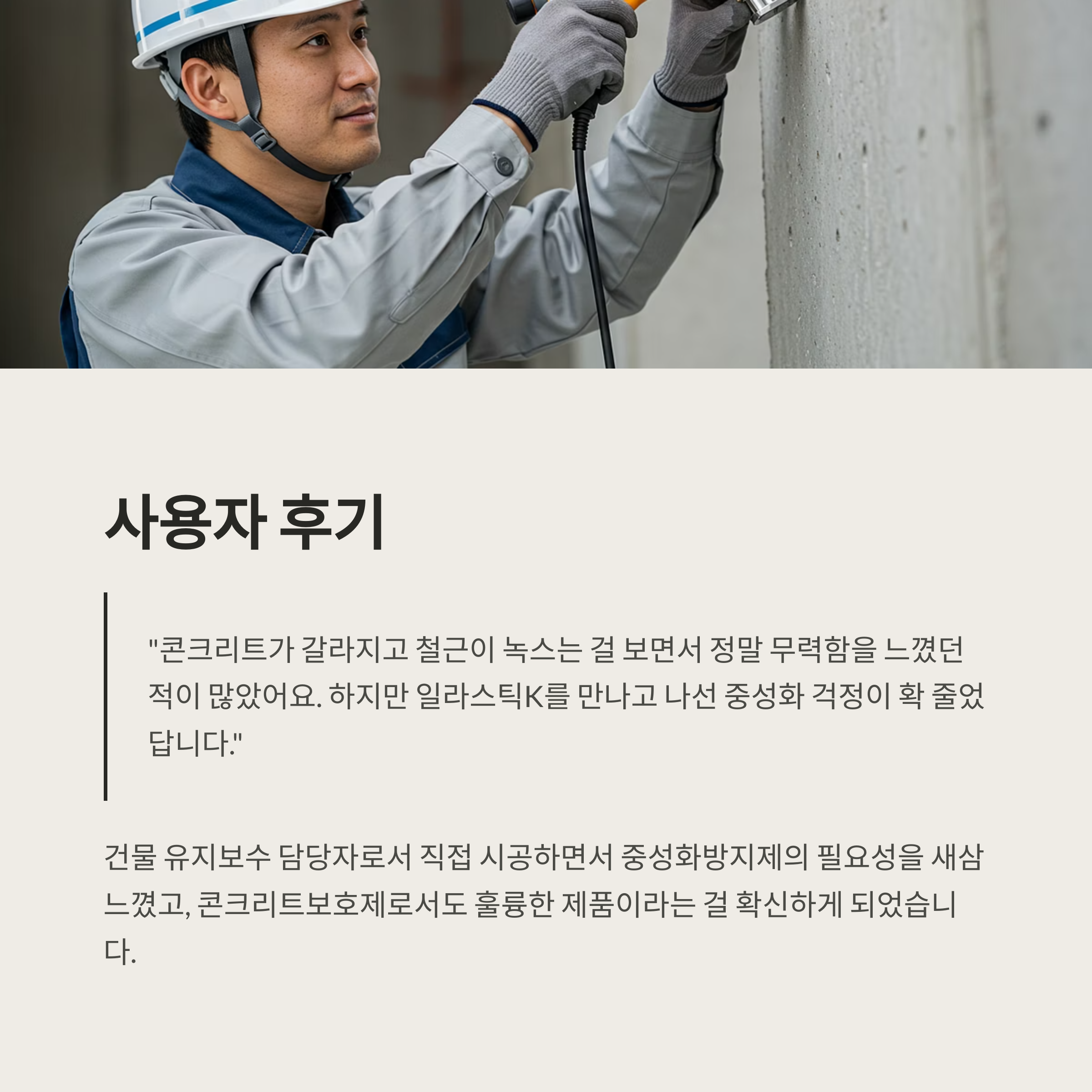 콘크리트가 갈라지고 철근이 녹스는 걸 보면서 정말 무력함을 느꼈던 적이 많았어요. 하지만 일라스틱K를 만나고 나선 중성화 걱정이 확 줄었답니다. 직접 시공하면서 중성화방지제의 필요성을 새삼 느꼈고, 콘크리트보호제로서도 훌륭한 제품이라는 걸 확신하게 되었죠. 저처럼 콘크리트 구조물 유지보수에 고민이 많으셨다면, 꼭 한 번 일라스틱K 써보시길 추천드려요. 확실히 다릅니다.