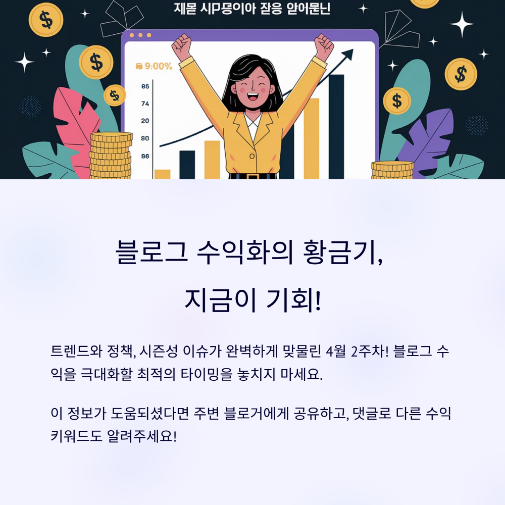 여기까지 정독해주셔서 정말 감사합니다. 사실 애드센스라는 게 운칠기삼 같기도 하지만, 결국 데이터 기반 전략과 콘텐츠 설계 능력이 핵심이에요. 오늘 알려드린 4월 키워드들만 잘 활용해도 최소 하루 100만원 이상은 꾸준히 나올 수 있습니다. 부업이든, 본업이든 블로그 수익화는 가능한 목표입니다. 다들 ‘오늘 한 포스팅’으로 내일 수익의 가능성을 만들어보자구요! 궁금한 점은 언제든 댓글로 함께 나눠요 🙂